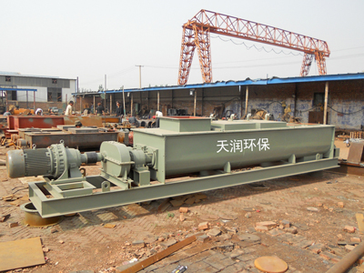 粉塵加濕機由二組螺旋葉片機均勻供料進入主機,把進入混料槽/攪拌槽的干灰粉狀物料由給水裝置定量供給的水進行強制混合、攪拌,同時將符合濕度要求的物料輸送至出料口排出,達到消除揚塵的目的。